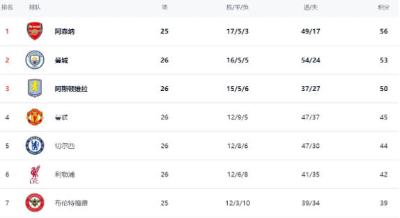 曼城贏球之后,繼續緊追阿森納,只落后阿森納3分,屈居第2。不過,曼城比阿森納多踢了1場比賽,這意味著他們在后面的比賽中需要更加努力,才能縮小差距或者實現反超。同樣贏球的阿斯頓維拉拿到50分,排名第3,他們雖然理論上還有沖擊冠軍的希望,但難度也不小。